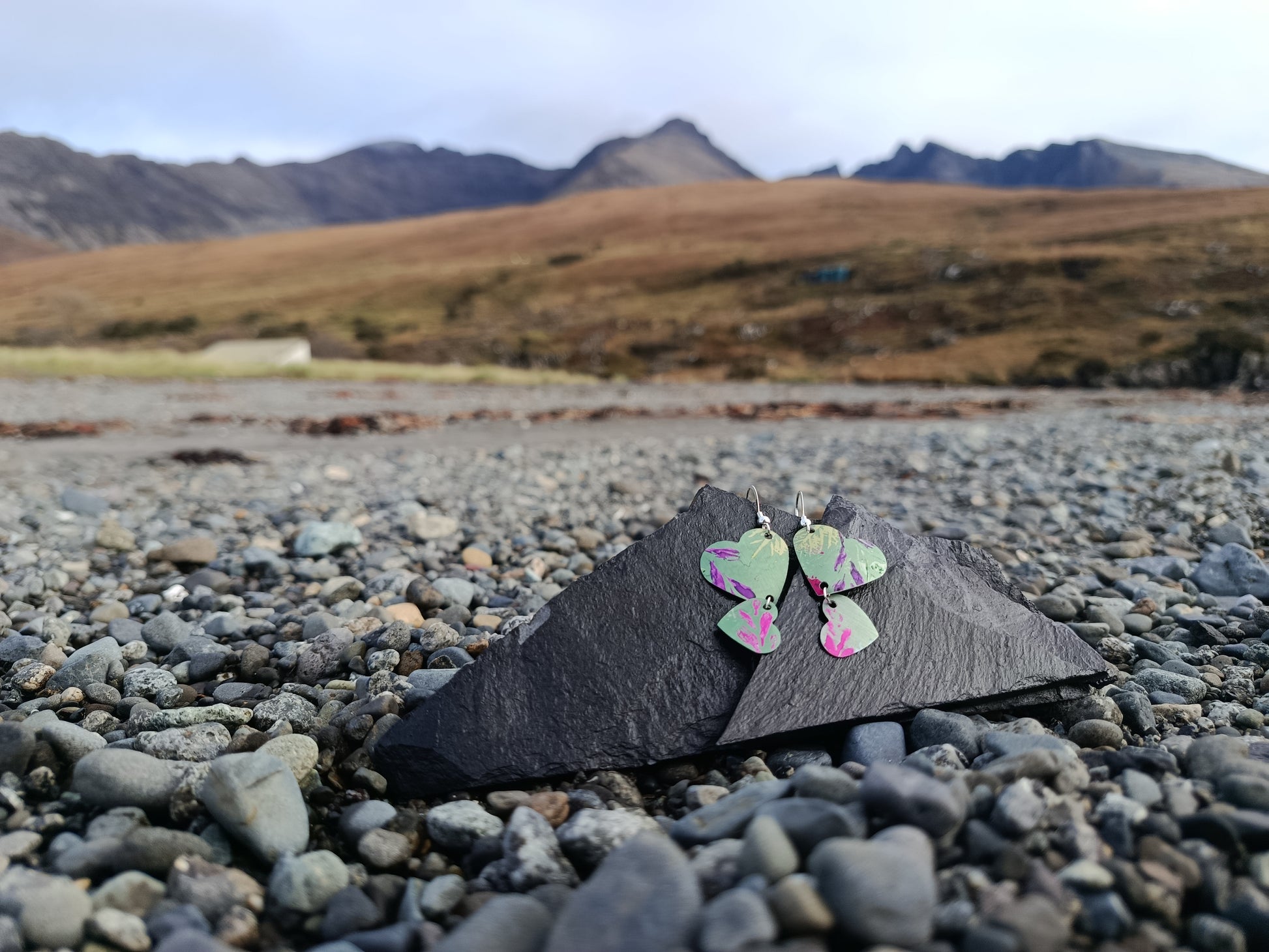 These earrings were hand dyed and imprinted with local wildflowers in Glenbrittle at the foot of the Cuillin Mountains. The loops are sterling silver. As each wildflower is unique, the earrings are similar to each other but not exactly the same. These earrings feature Meadowsweet, Crocosmia and Yarrow.