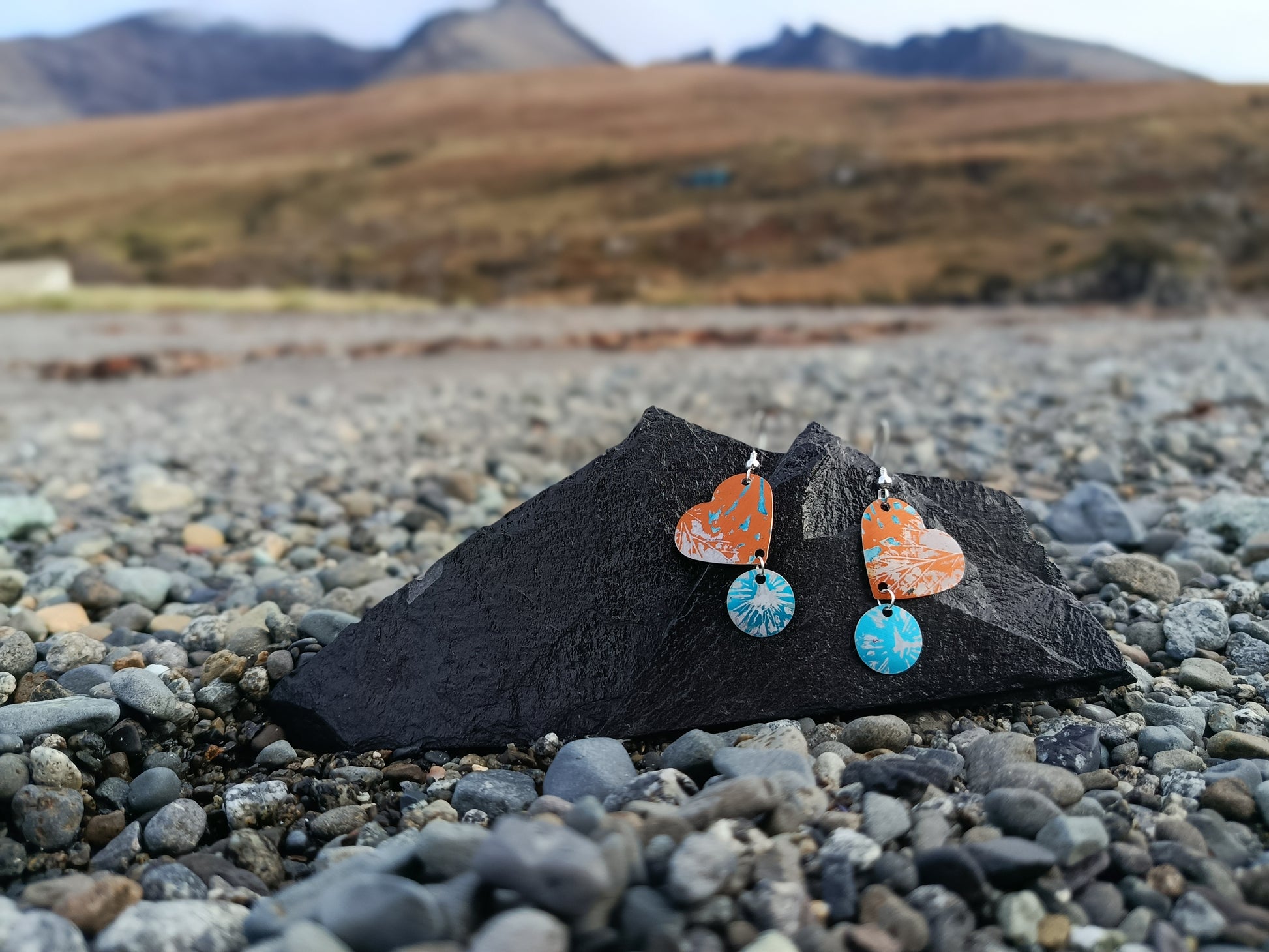 These earrings were hand dyed and imprinted with local wildflowers in Glenbrittle at the foot of the Cuillin Mountains. The loops are sterling silver. As each wildflower is unique, the earrings are similar to each other but not exactly the same. These earrings feature Meadowsweet and Yarrow.
