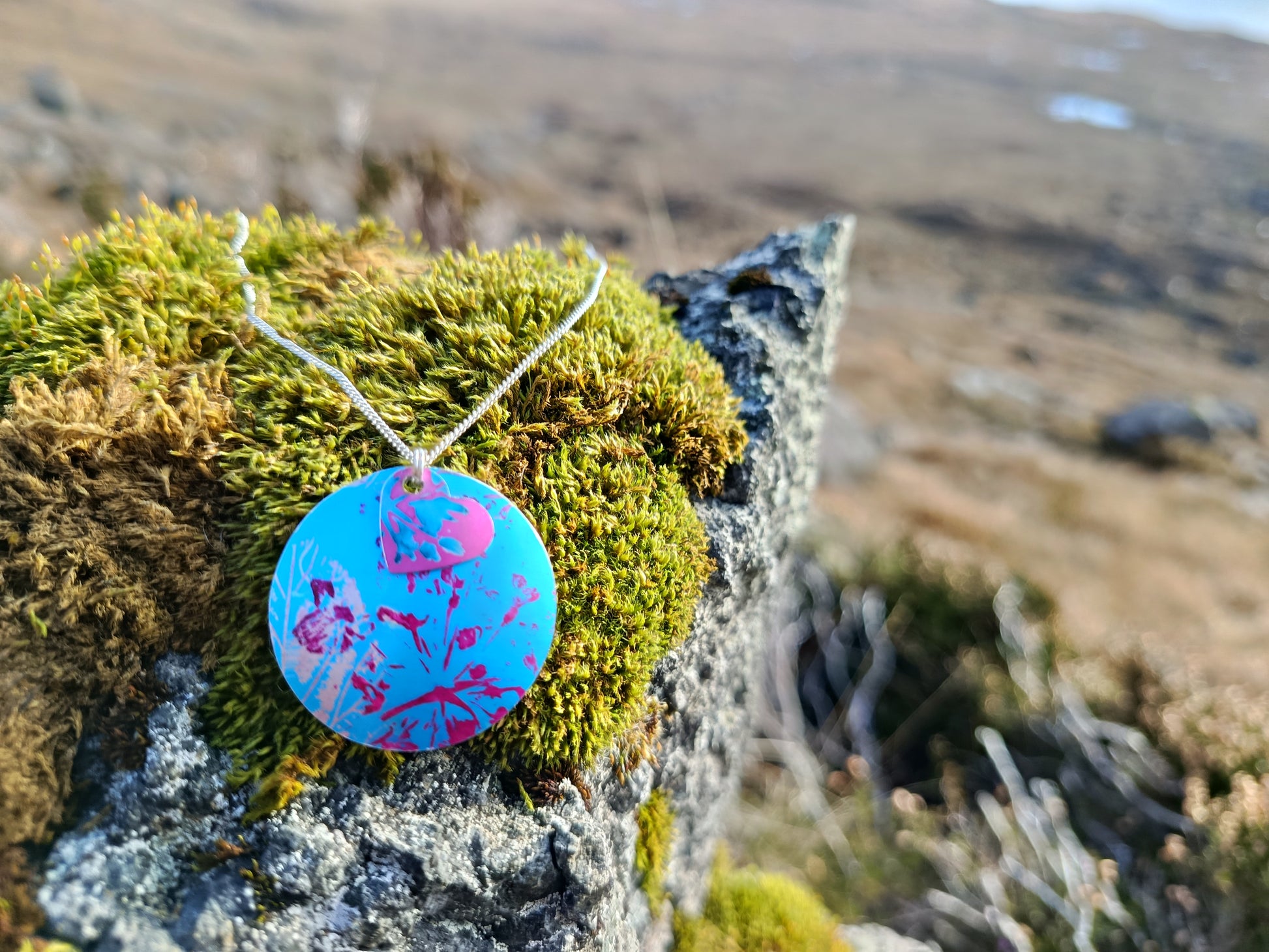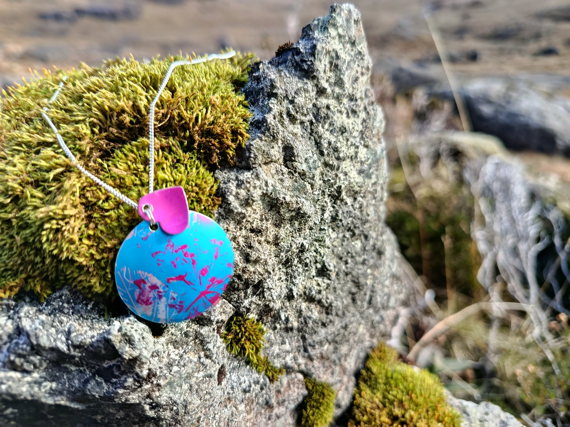 This pendant was hand dyed and imprinted with local wildflowers in Glenbrittle at the foot of the Cuillin Mountains. The 16 inch chain and jump ring is sterling silver. Each one is unique. This pendant features two layered pendants both with an imprint of Meadowsweet, Crocosmia and Meadowpea.